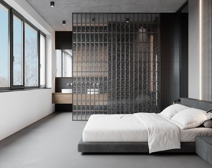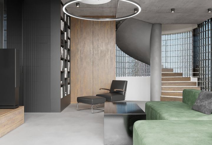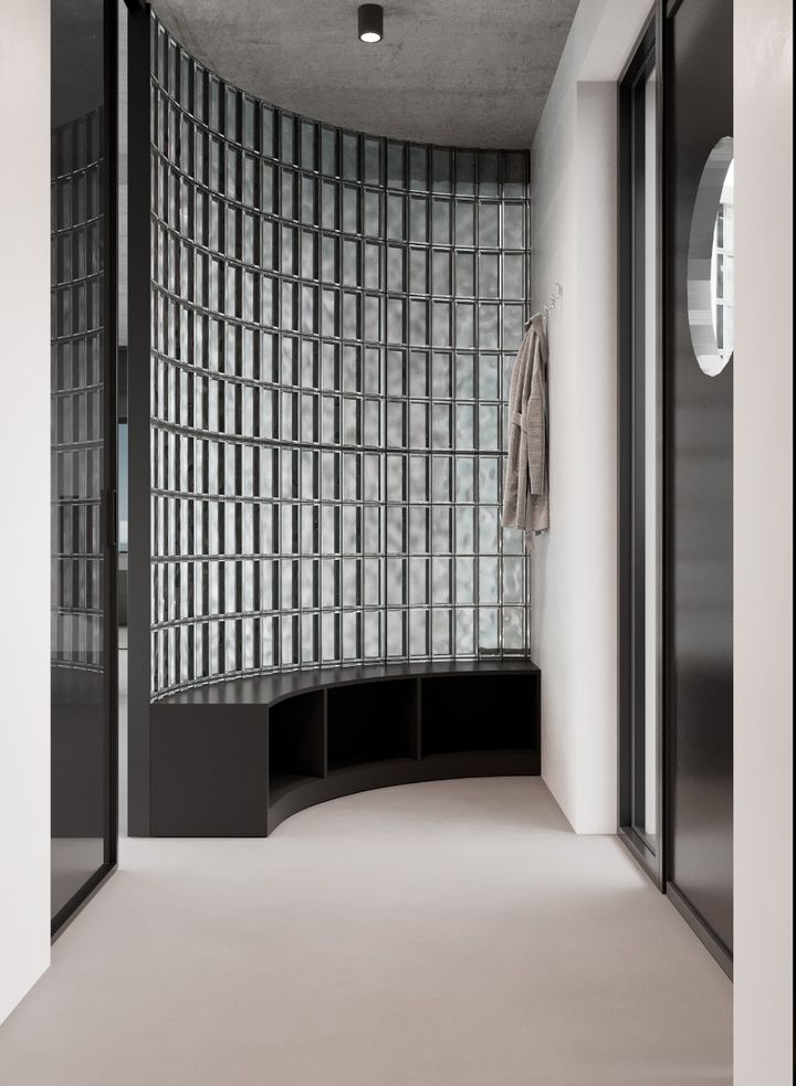 V prostoru dominují surové materiály jako pohledoVý beton, přírodní dřevo. Odkazem k funkcionalismu jsou také skleněné tvárnice - luxfery, které jsou